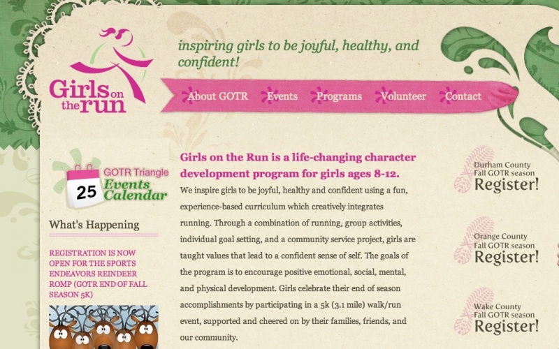 This website is a good example of subject and design being in tune. It has eco/healthy/recycle feel and look with its green and cardboard beige background, and it uses details in girly pink. Its minor drawback is too wide footer area.