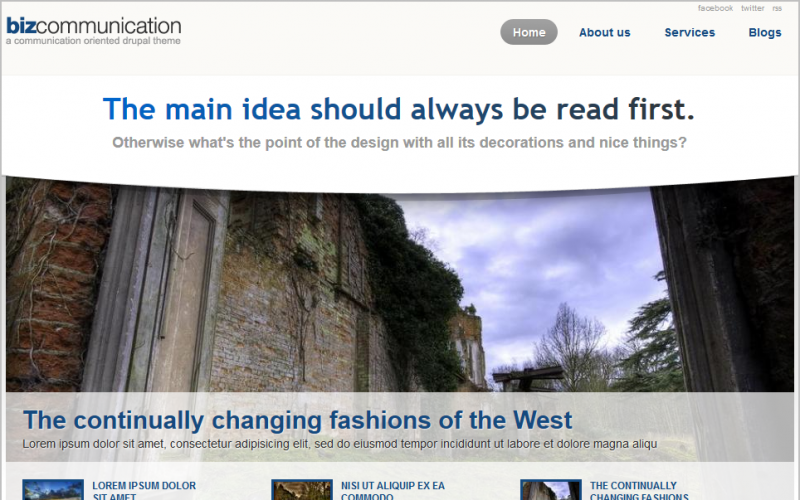 Biz Communication is a new simple premium Drupal theme for businesses and corporations. The design concept came from requests from customers who wanted a simple, yet intuitive Drupal theme design for a business or corporate website. The Biz Communication theme makes use of a simple front page slider and three main block regions below the slider for a businesses main services/mission statement, about section or testimonials, or for other block regions.